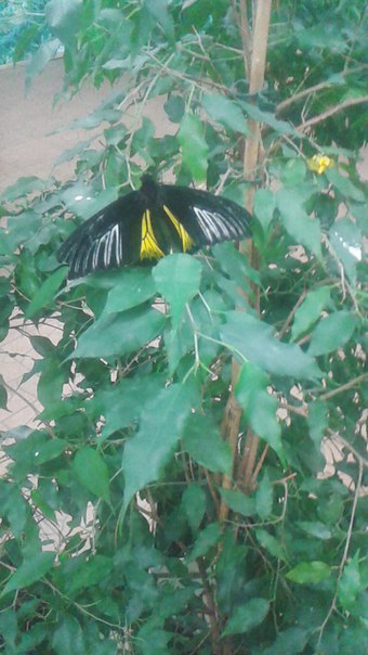 Первыми кого мы увидели, были гигантские, размером с ладонь, ночные бабочки, возле которых мирно примостились бабочки «Павлиний глаз». На сетке, вниз головой висели бабочки - божьи коровки (так мы их назвали из-за красного, с черными точками окраса). Некоторые летали по помещению. Кроме бабочек в помещении также находились маленькие птички.